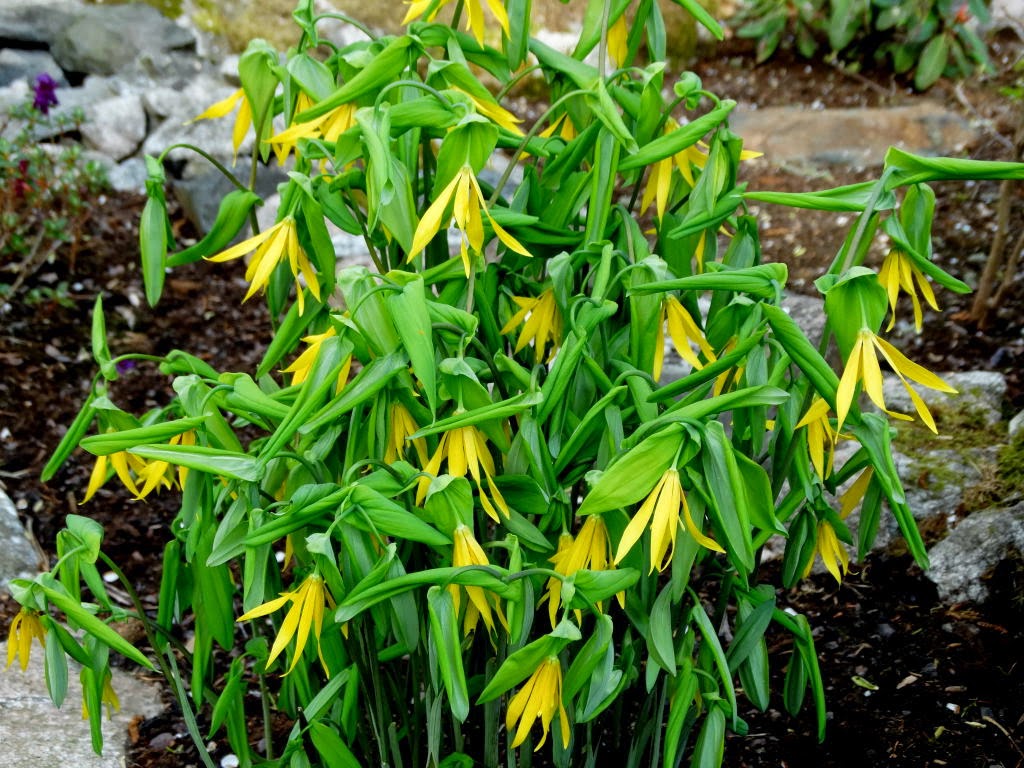 Uvularia grandiflora - sorgklockan med sina nickande blommor är en lättodlad skönhet om den bara får leva i en skuggigare miljö och en fuktighetshållande torvjord. Blomningen går snabbt men den pryder ändå sin plats med en vacker fräsch grönska hela säsongen.